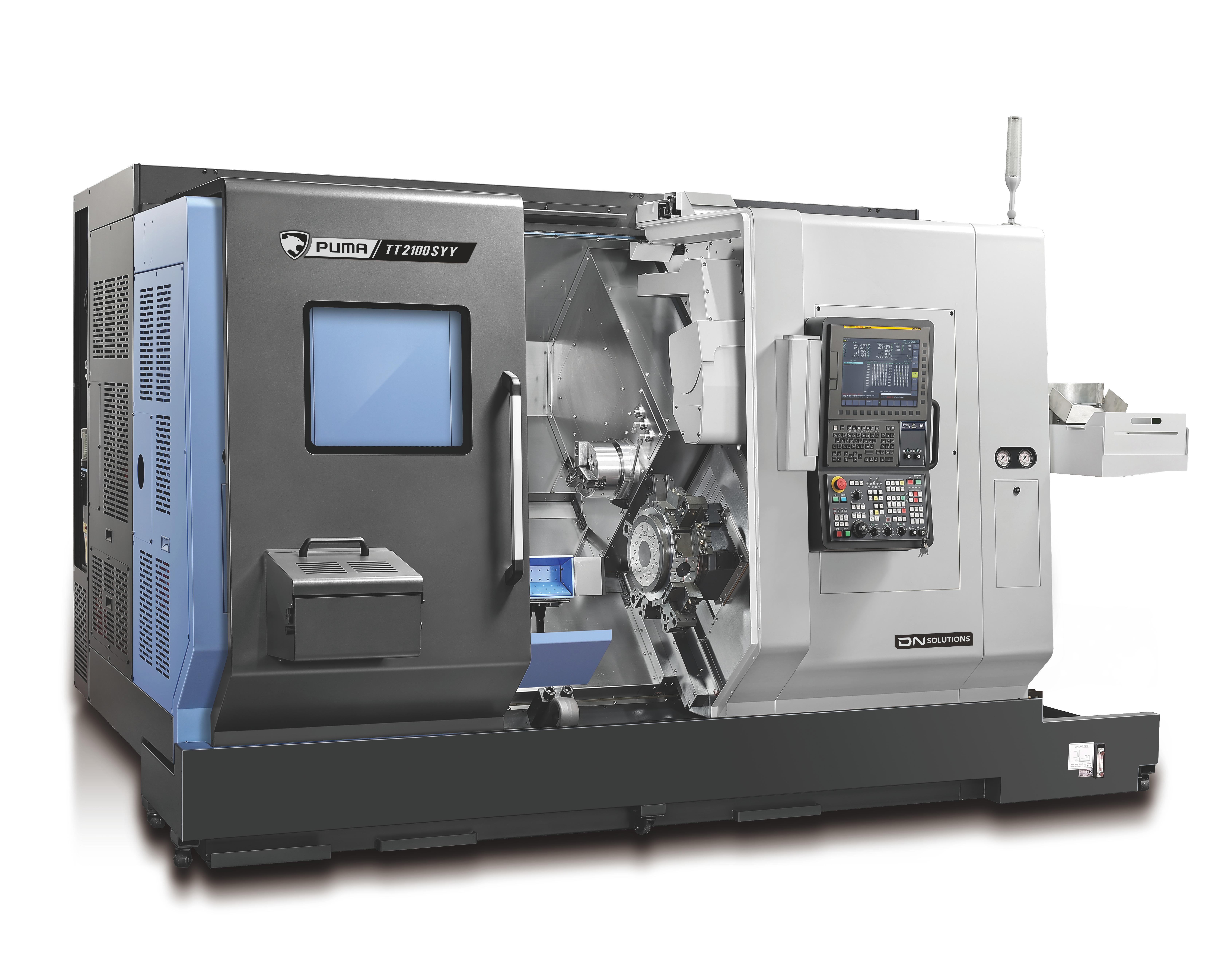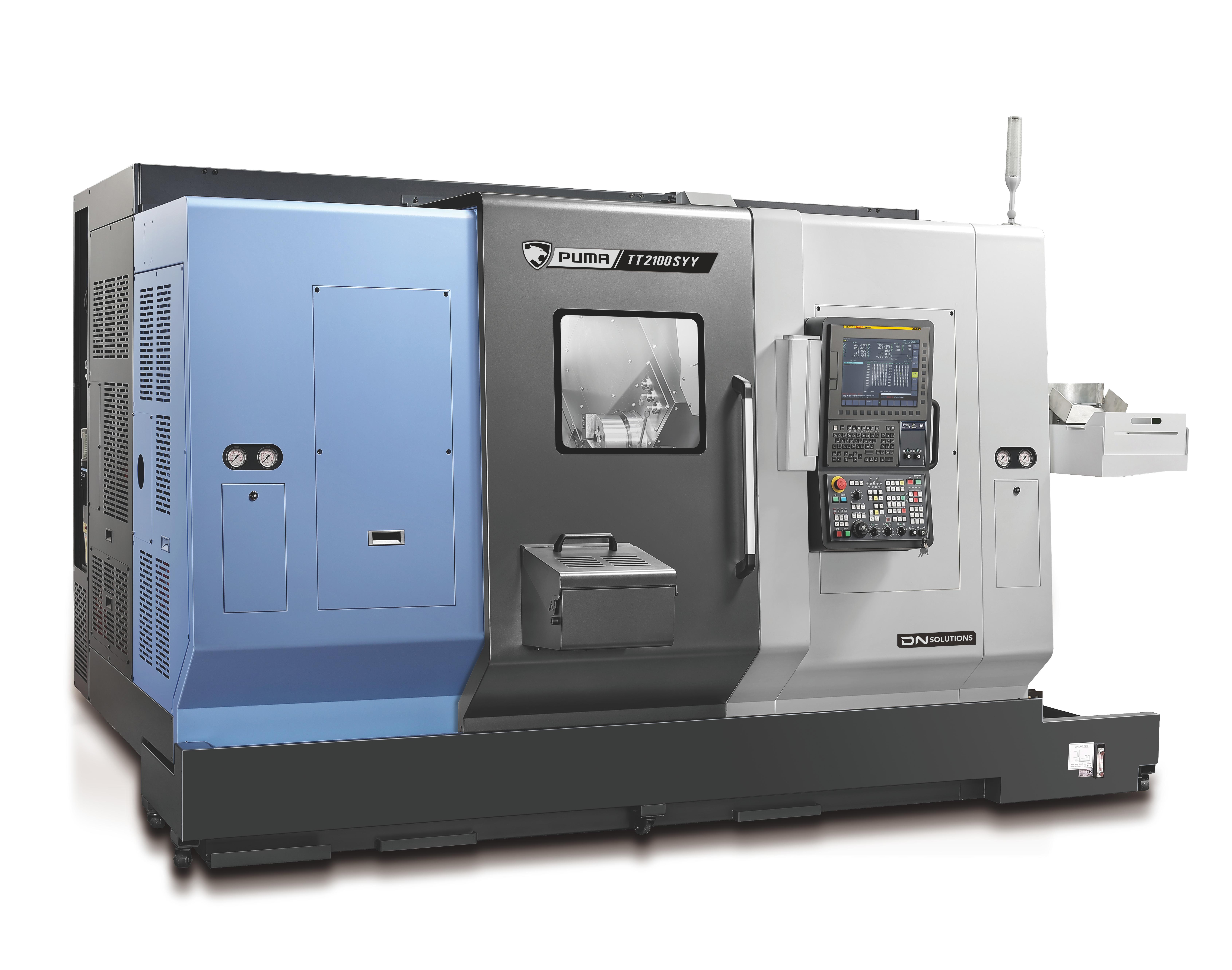 PUMA TT1300-, TT1800-, TT2100- og TT2500-serien er horisontale dreiesentre med høy produktivitet, med stangkapasitet fra 42 mm til 81 mm. Maskinene er utstyrt med to motstående spindler og øvre/nedre revolvertårn, og har Y-akse-funksjon for samtidig to-siders maskinering. Begge spindlene har samme effekt og kapasitet, som muliggjør uavhengig drift og automatisk utstøting av emner – noe som øker produktiviteten betydelig. PUMA TT-serien er foretrukket globalt og er kjent for ytelse og driftssikkerhet i toppklassen, og er ett av DN Solutions’ mest solgte produkter. |