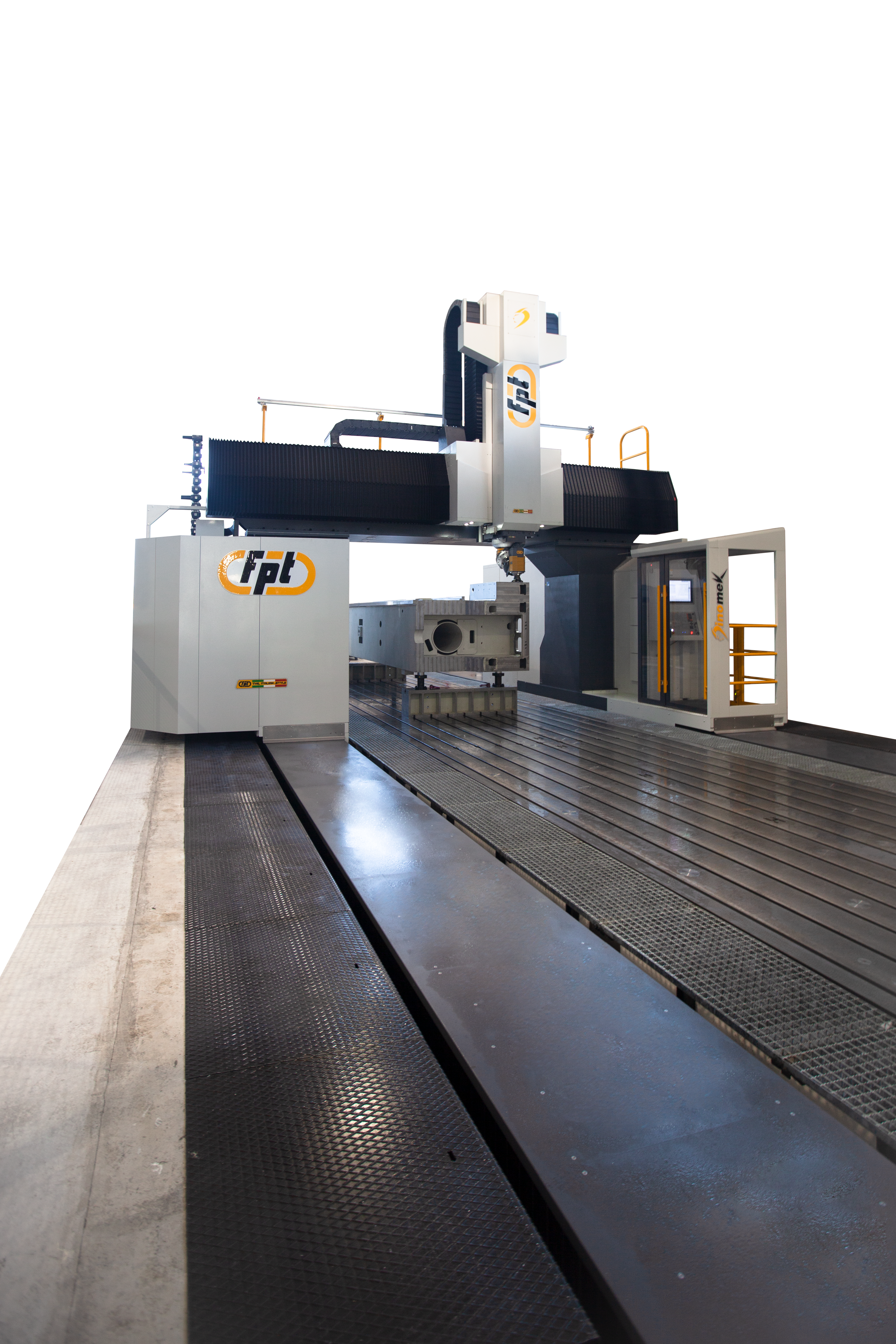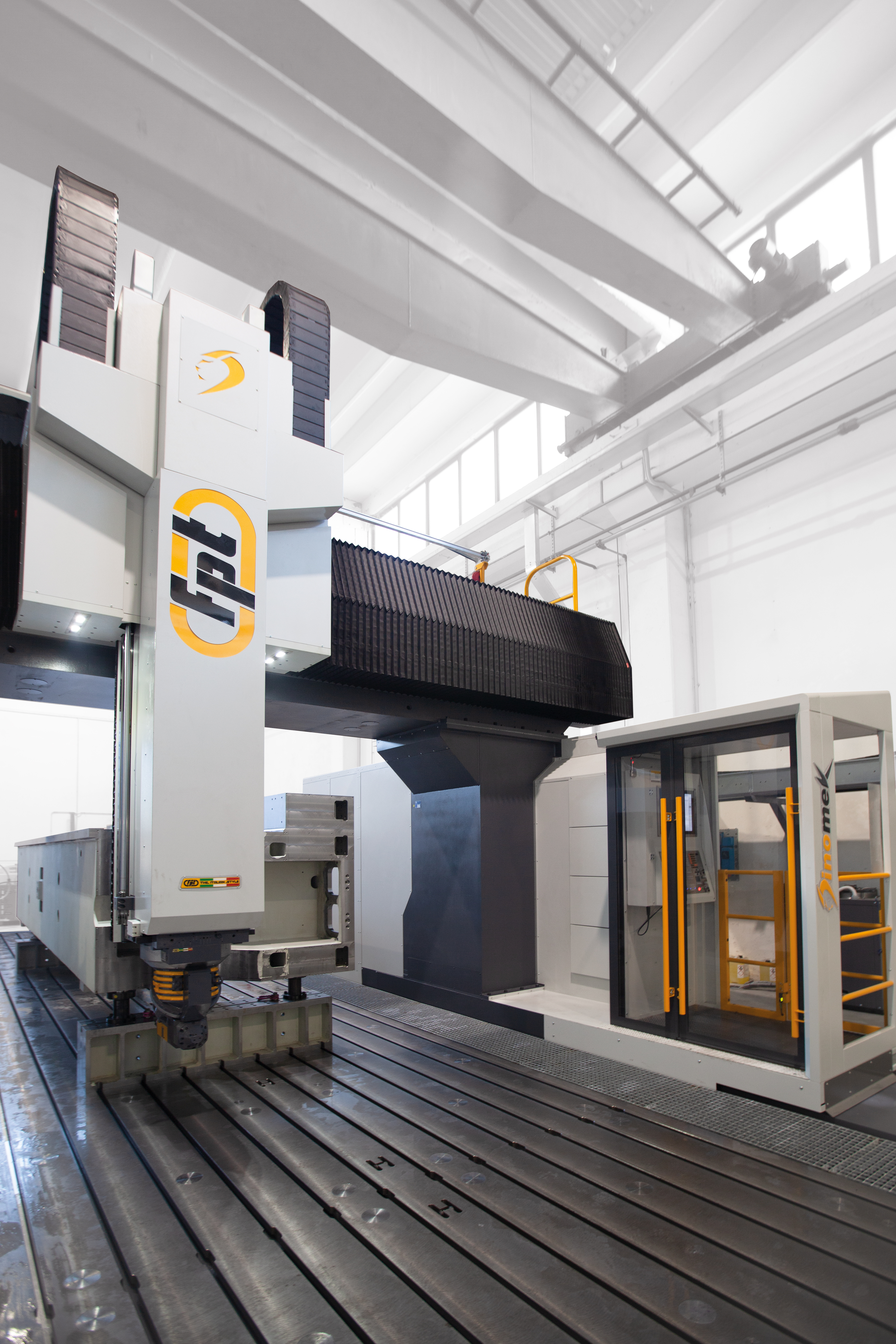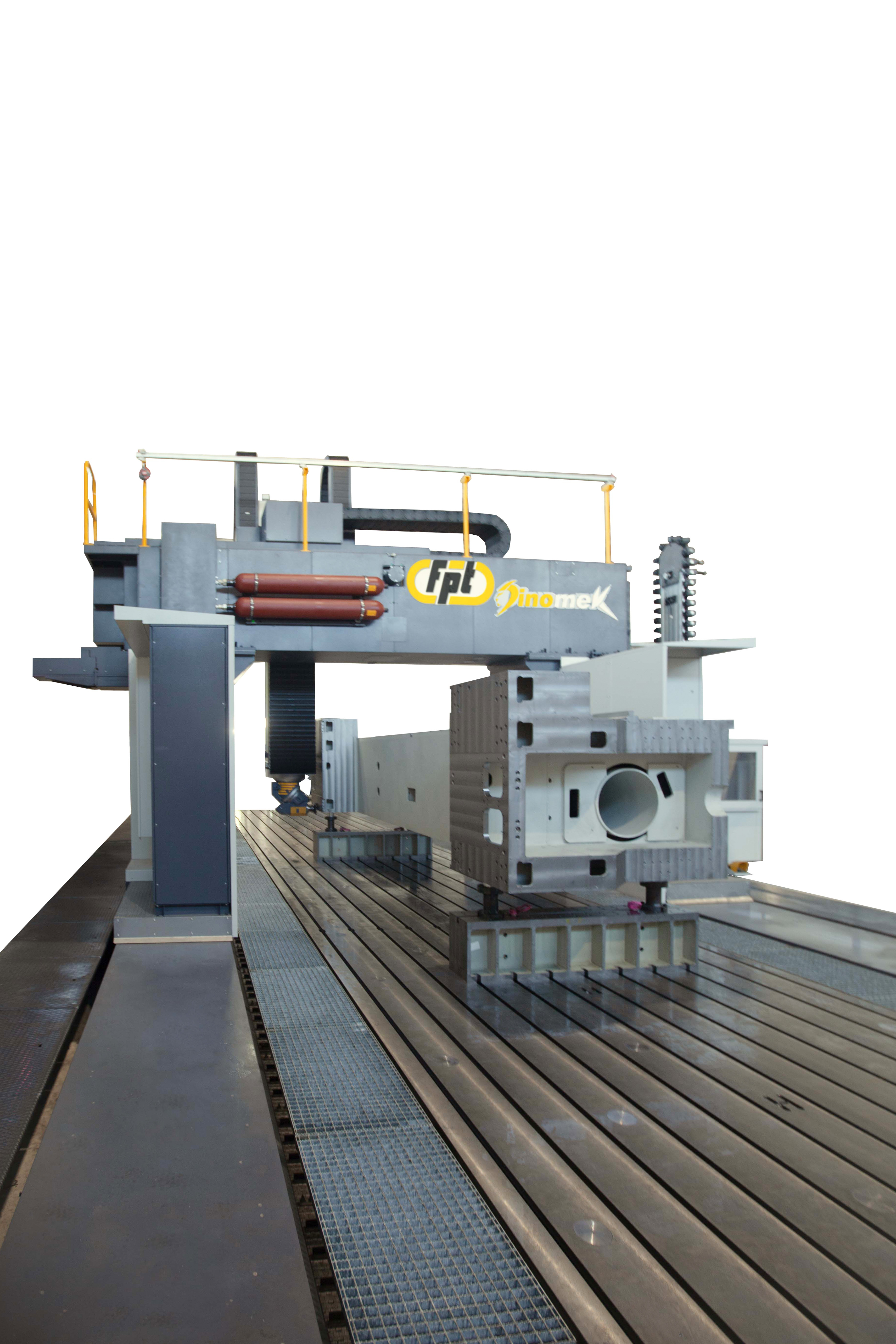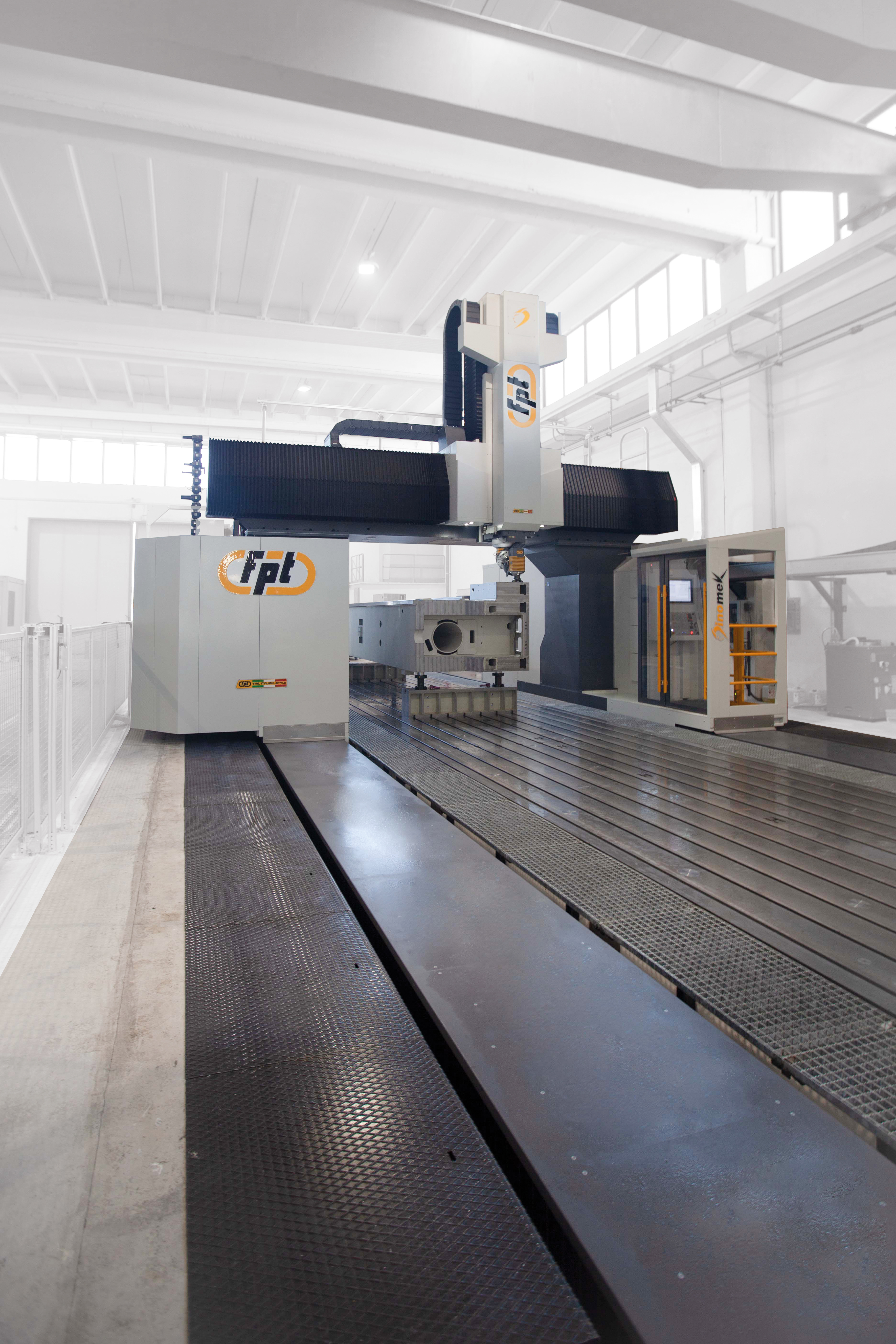 Dinomek is a moving-gantry vertical milling machine designed for the machining of large components with power, flexibility, and operator-friendly access. Its unique lowered base morphology (patent pending) allows operators to safely walk into the machining area, eliminating bulky telescopic covers while keeping guideways and axis systems fully protected. This design ensures easier cleaning, faster chip removal, and more efficient machine maintenance. Ideal For |