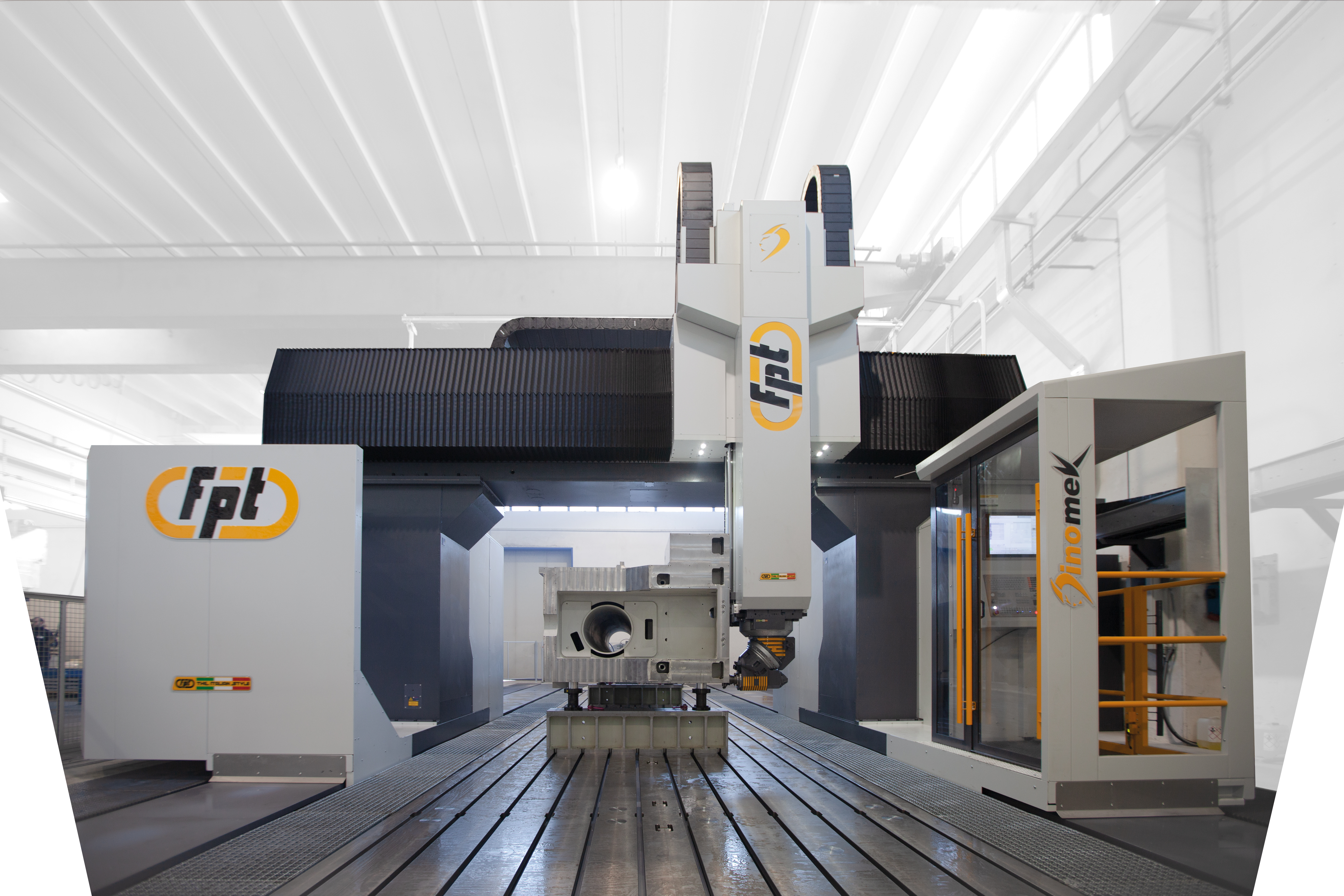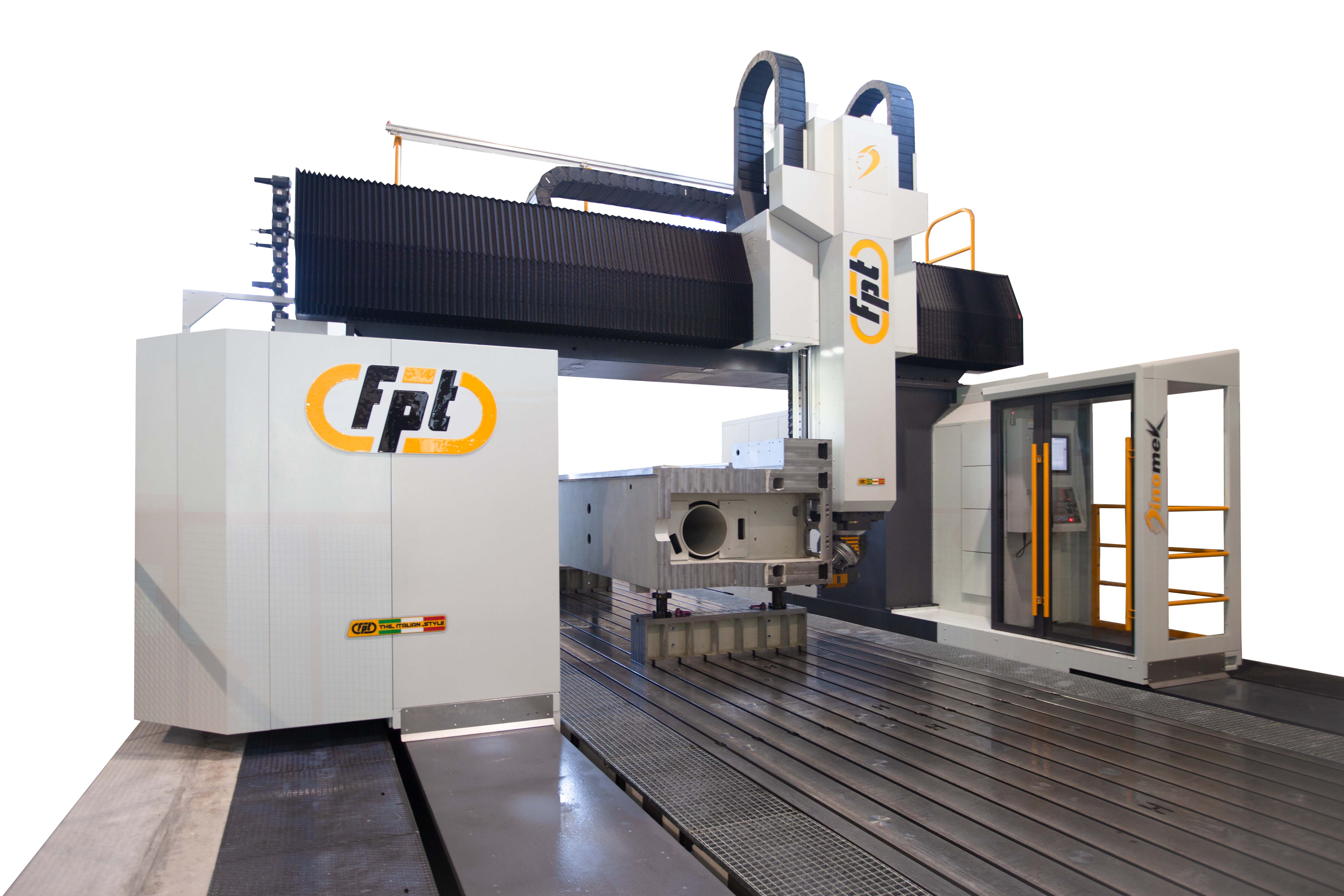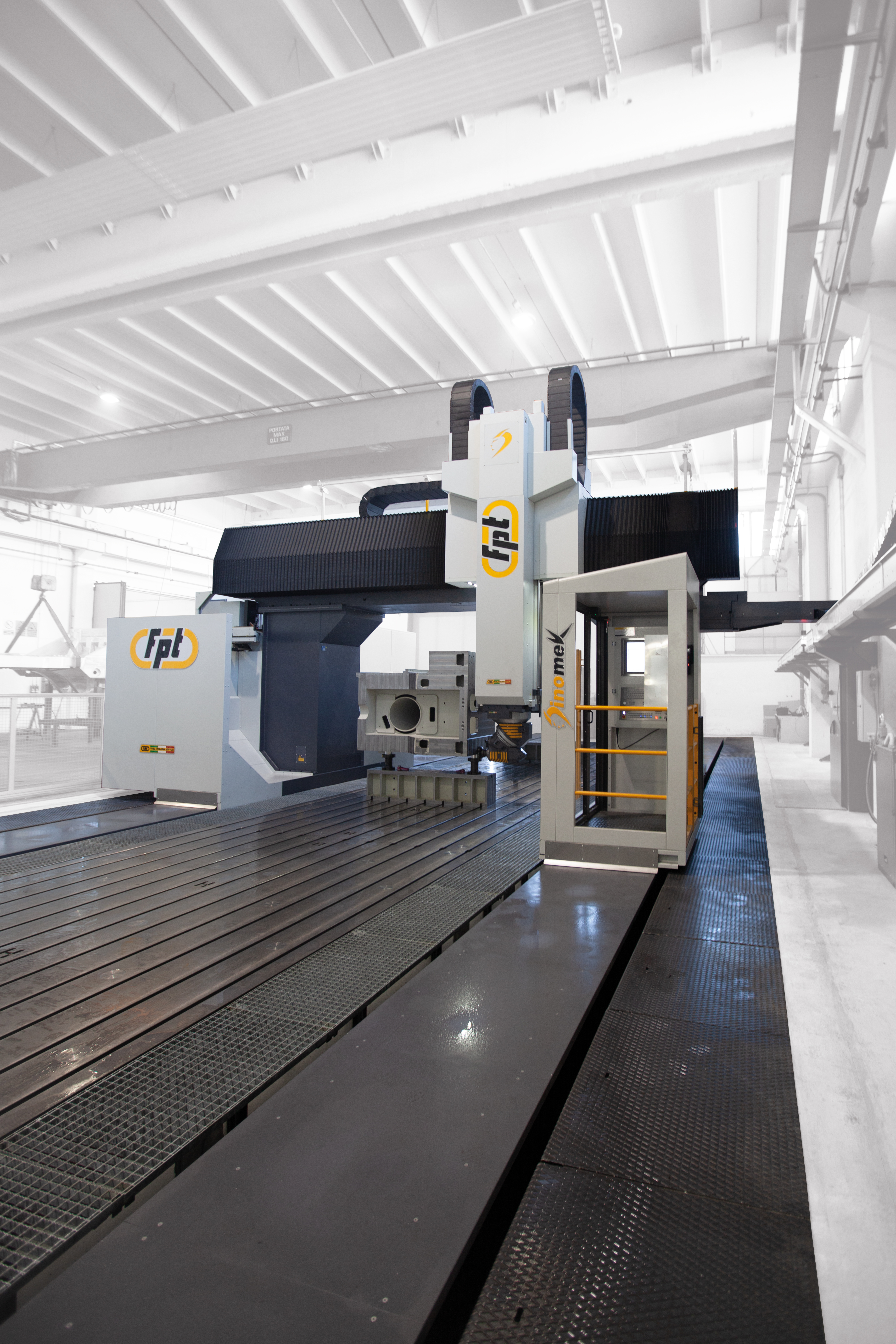 Dinomek is a moving-gantry vertical milling machine designed for the machining of large components with power, flexibility, and operator-friendly access. Its unique lowered base morphology (patent pending) allows operators to safely walk into the machining area, eliminating bulky telescopic covers while keeping guideways and axis systems fully protected. This design ensures easier cleaning, faster chip removal, and more efficient machine maintenance. Ideal For |